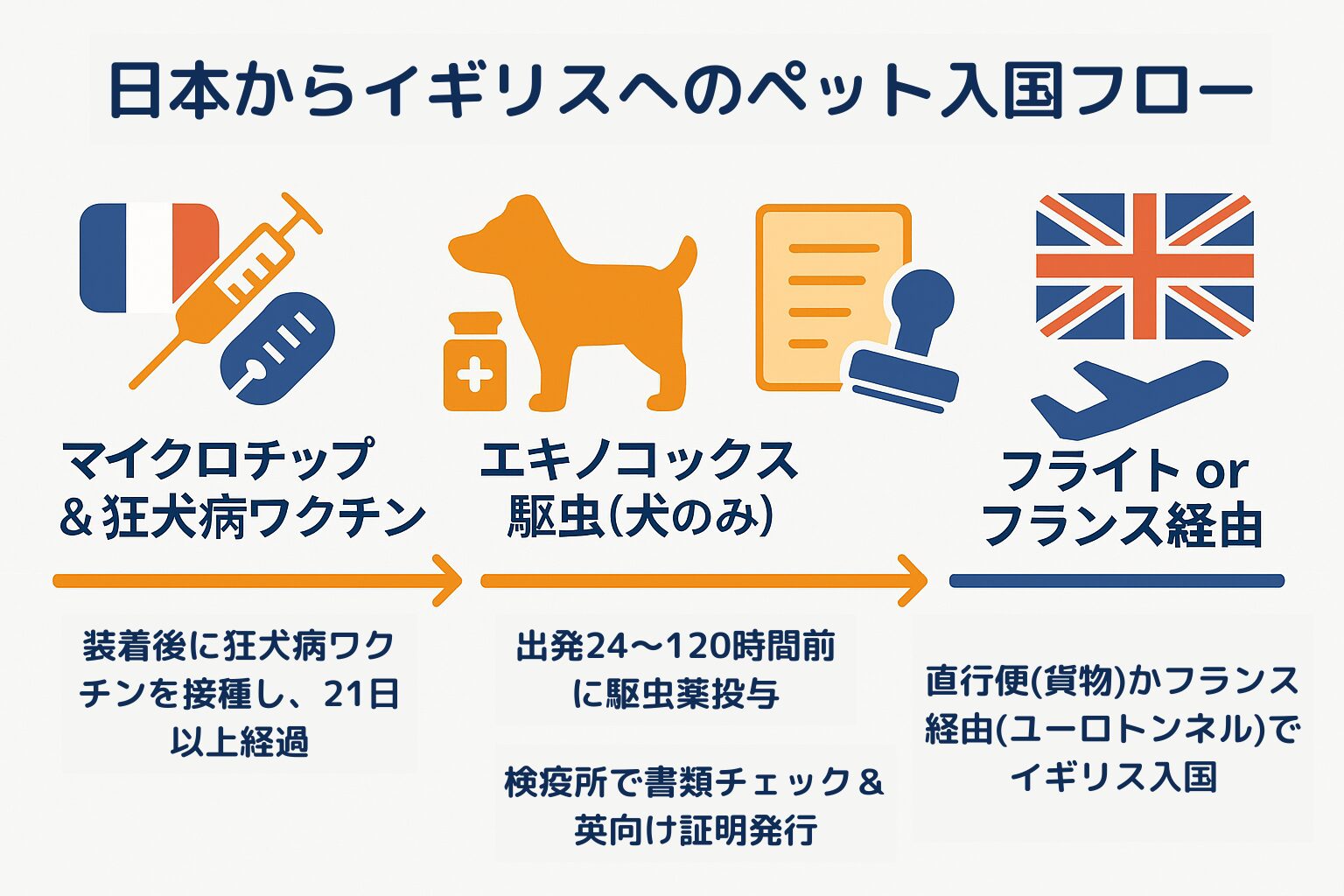 日本からイギリスへのペット渡航は、直行便(貨物輸送)かフランス経由(機内同伴や受託手荷物+ユーロトンネル)を選ぶのが一般的な二大ルートです。どちらもイギリス入国要件(マイクロチップ、狂犬病ワクチン、犬の駆虫など)を満たさなければならず、フランス経由の場合はEU要件も追加されて書類管理が二重になります。