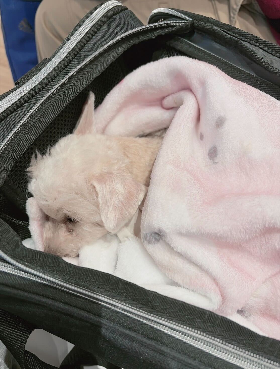 - Durante el viaje de larga distancia de Japón a México, Kirara soñaba en su bolsa de mano. Gracias a los minuciosos preparativos realizados con antelación, tanto el dueño como el perro pudieron relajarse y disfrutar del viaje.