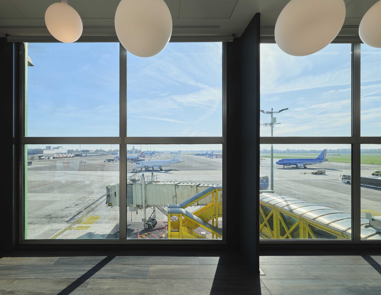 Localizado perto dos portões A17–A18, disponível das 5h30 da manhã até às 21h30 da noite.